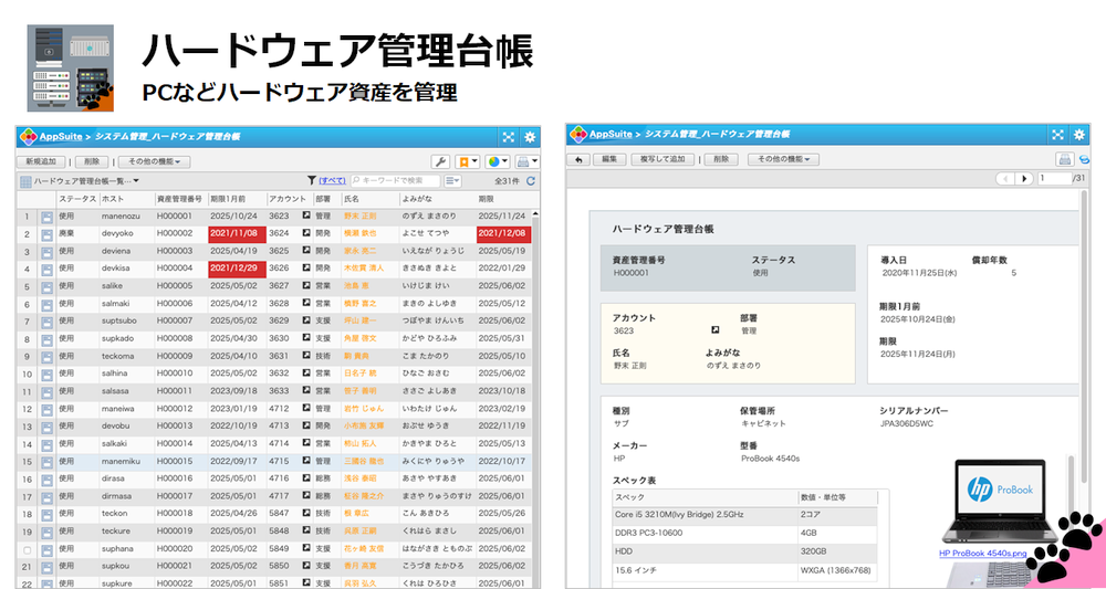 ハードウェアの基本情報に加え、資産管理番号の自動採番、利用者の割り当て、償却年数の管理、リース期間の管理・警告など、ハードウェアの管理に必要となる多くの機能を備えています。