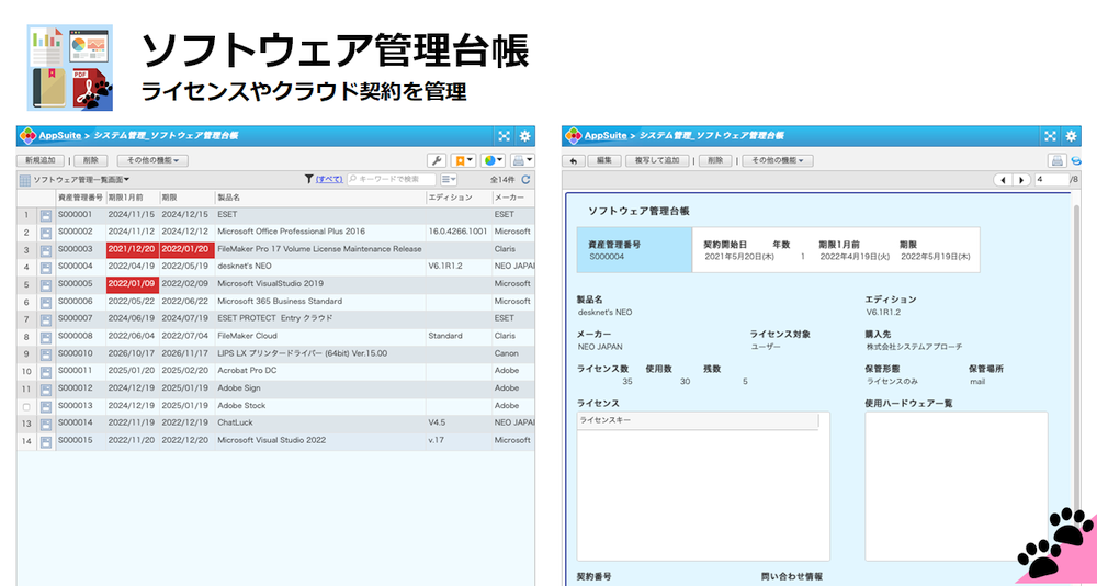 ソフトウェアの基本情報に加え、資産管理番号の自動採番、ライセンス保有数および利用数の管理、ライセンスキー管理、契約期間の管理・警告など、管理に必要となる多くの機能を備えています。