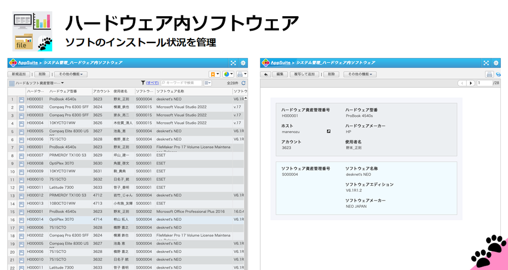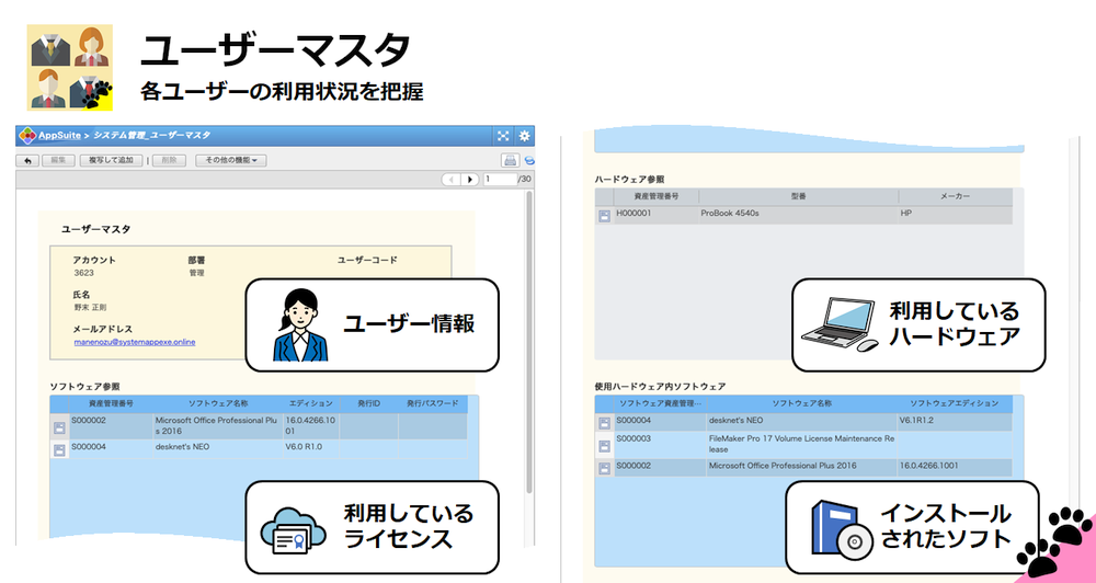 管理しているユーザーごとに、どのソフトウェアおよびどのハードウェアを利用しているか、またそのハードウェアにはどのソフトウェアがインストールされているかをひと目で把握できます。