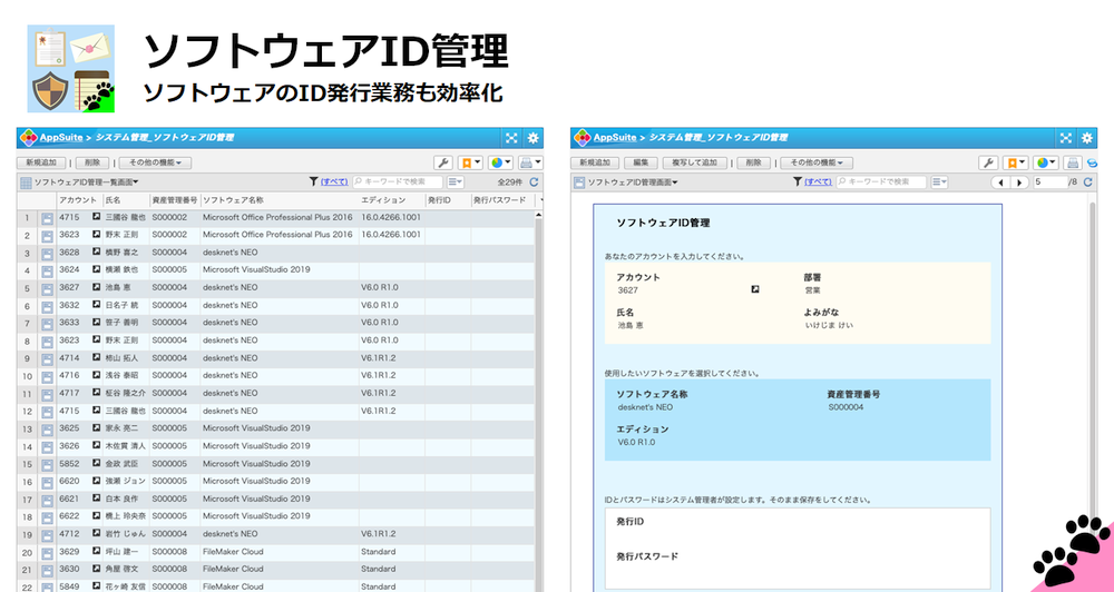 組織が保有するPCなどのハードウェアの情報と、契約中のクラウドサービスや購入したパッケージ製品などソフトウェア情報、またそれら利用者の情報を一元管理することで、情報資産の運用・管理を効率化できるアプリ集です。(提供:株式会社システムアプローチ)