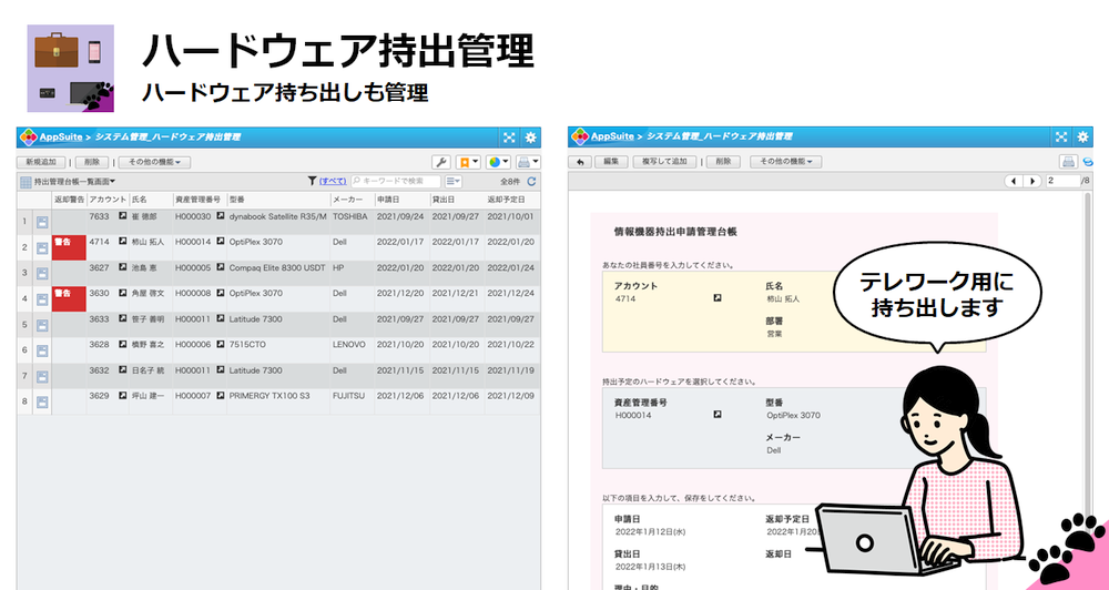利用者が持ち出す機器を選択し、持ち出しの理由や目的、返却予定日などを登録することで、機器の持ち出し履歴として残すことができます。
