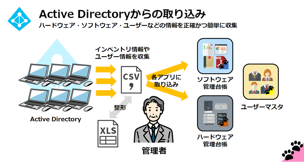 ネットワーク上で稼働状態にあるWindows PCから、インベントリ情報を自動収集できます。各アプリに対してスムーズにファイル取り込みが行えるよう、CSVファイル作成ツールとしての機能を持たせています。さらにActive Directoryからは、ユーザー情報を取得して取り込み可能な様式に整えることができます。