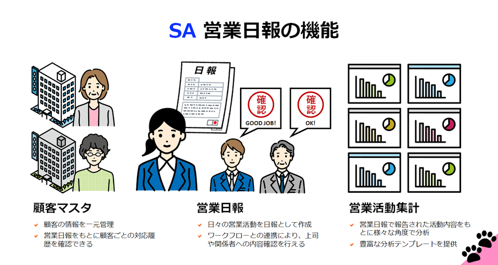 SA 営業日報は、顧客・取引先情報を管理する「顧客マスタ」、ワークフローとの連携で営業日報の提出を行う「営業日報」、営業日報で報告された活動内容を蓄積し分析を可能とする「営業活動集計」の3つのアプリで構成されています。ワークフローで報告された多くの活動データを、自動的に集計・分析用アプリに集約することで、営業活動の可視化・分析・改善を実現します。