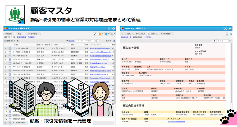 顧客マスタアプリで、顧客・取引先の情報を一元管理できます。