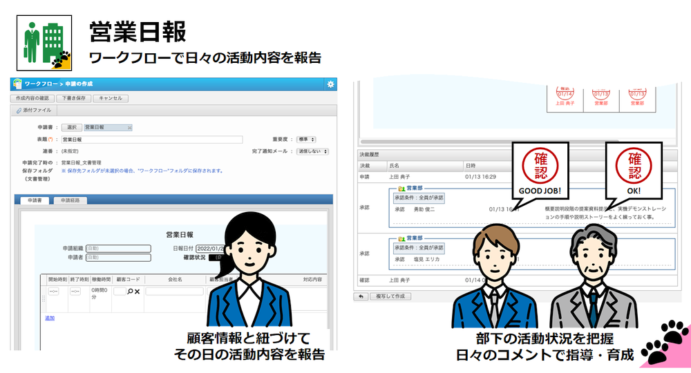 営業担当は、その日の顧客に対してどんな活動を行ったかを「営業日報」にまとめ、ワークフローで提出します。