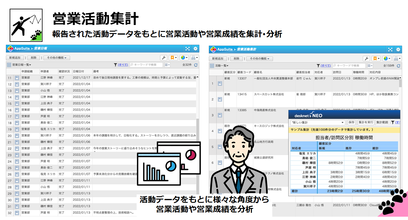 営業から報告された日々の活動データは、自動的に「営業活動集計アプリ」に蓄積され、営業活動状況の集計・分析を行うことができます。