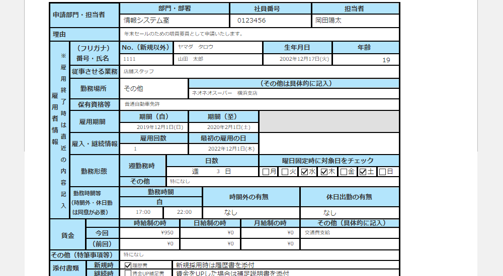 アルバイト社員採用 申請書アプリ