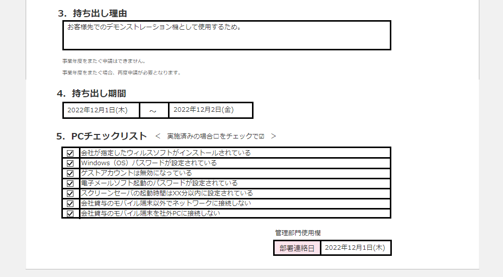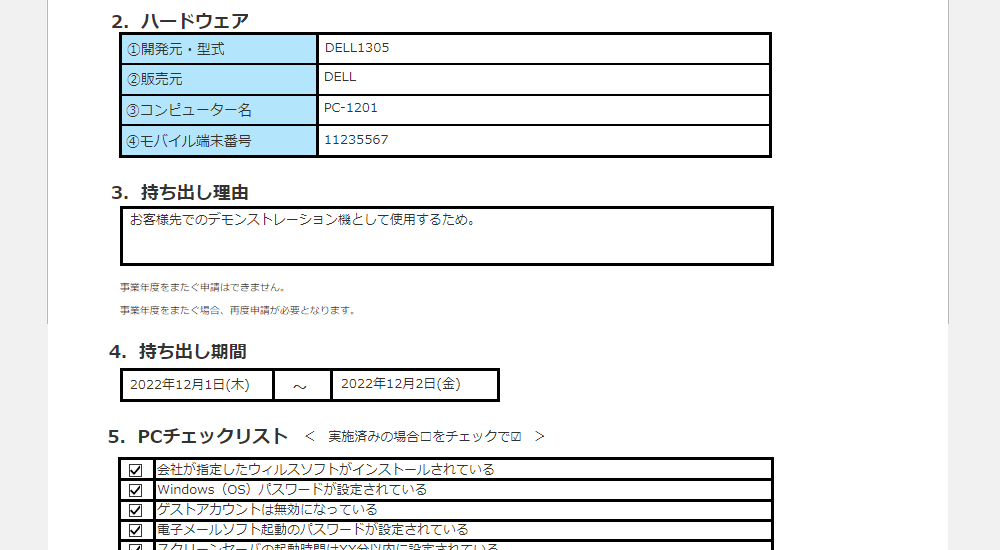 desknet's NEOのワークフロー機能と連携し、ノートパソコンなど機器の社外持出しを申請するアプリです。