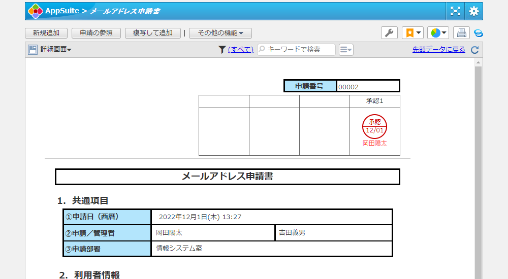申請後のデータはAppSuite上に保管され、過去の申請状況の集計、検索・参照が簡単に行えます。