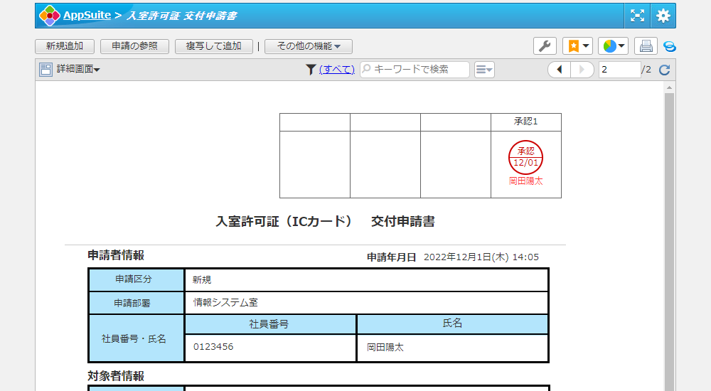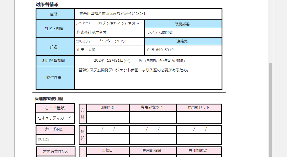 フォーマットへ入力するだけで入室許可証の発行や登録内容変更といった申請書を作成することができます。このアプリをワークフローと組み合わせて、申請・承認をスムーズに行うことができます。