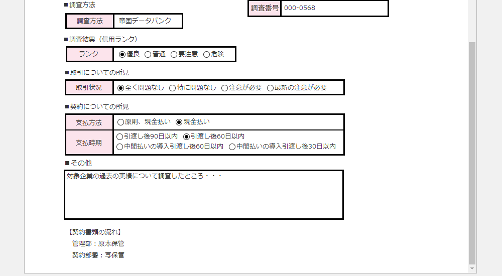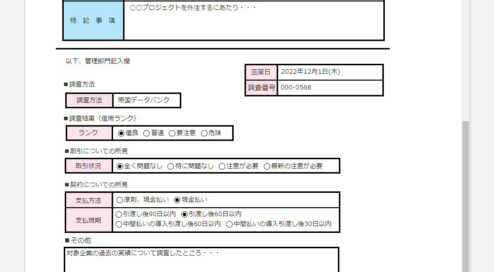 申請書内に調査の担当部署の回答欄を設け、依頼に対する調査結果や所見の表示も行えます。依頼書は、書式上で調査結果を知ることができます。