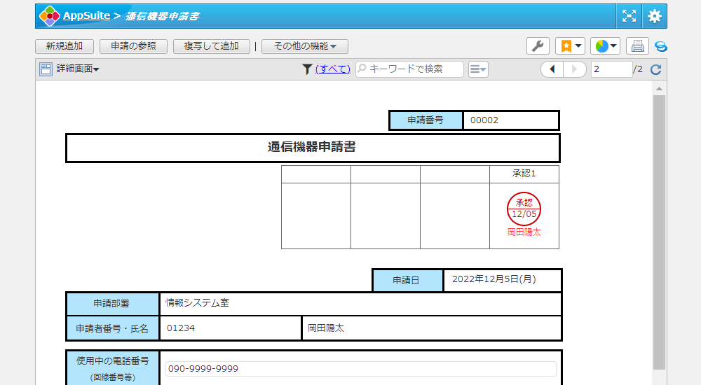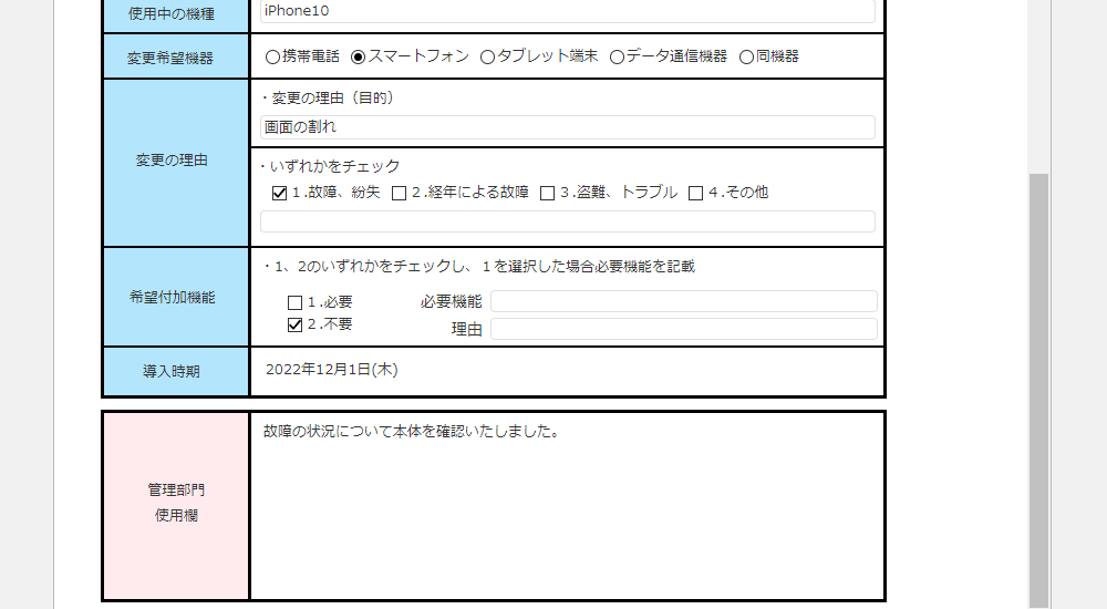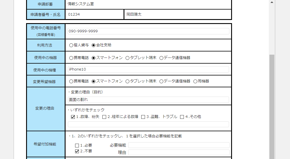 フォーマットへ入力するだけで機器の新たな利用、変更といった申請書を作成することができます。このアプリをワークフローと組み合わせて、申請・承認をスムーズに行うことができます。
