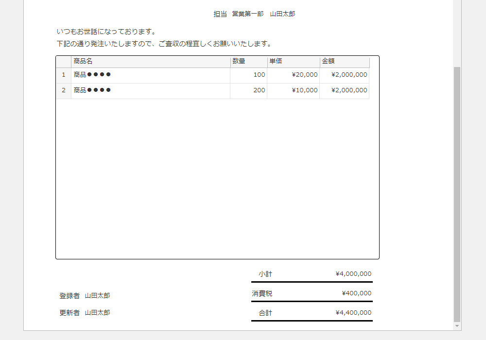 発注番号、発注先宛名、発注先住所、電話番号、FAX番号、会社名、担当者名、発注商品名、数量、単価、金額、小計、消費税、合計金額、データ登録者、データ更新者