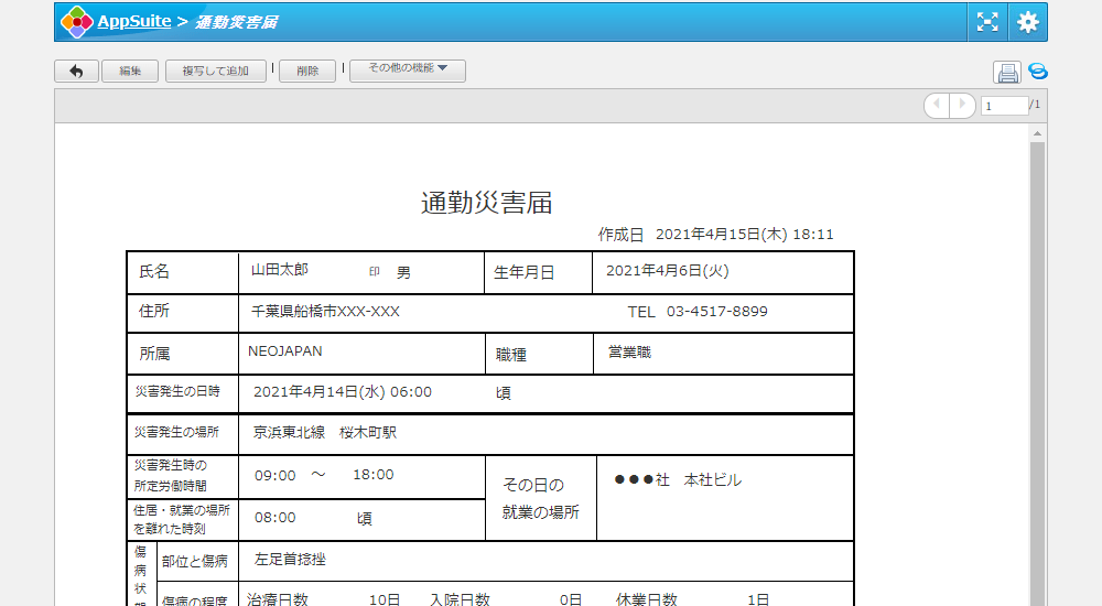 申請者は決められたフォーマットに負傷、疾病に関する情報を入力するだけです。アプリで作成することで、紙やExcelへの面倒な記入と共有、最新のファイルがどれかわからないといったわずらわしさがなくなります。