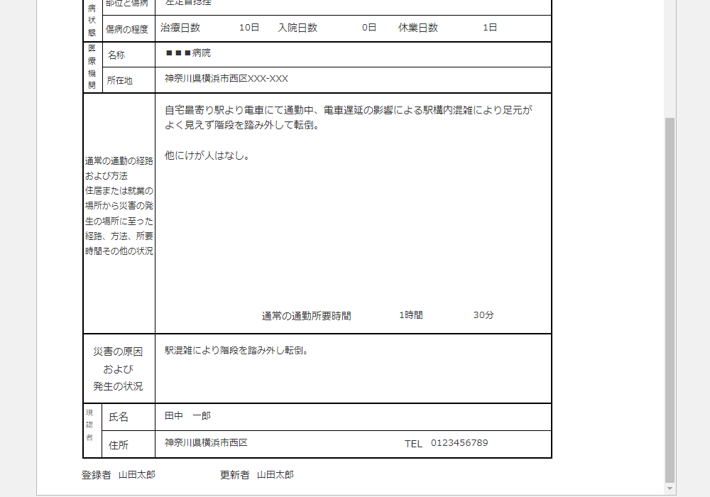 作成日、被災者氏名、性別、生年月日、住所、電話番号、所属部署、職種、災害発生日時、場所、所定労働時間、作業場所、傷病状態、治療日数、入院日数、休業日数、医療機関名称、医療機関住所、災害発生場所までの経路、通勤所要時間、災害の原因・発生の状況、確認者氏名、確認者住所、確認者電話番号、データ登録者、データ更新者