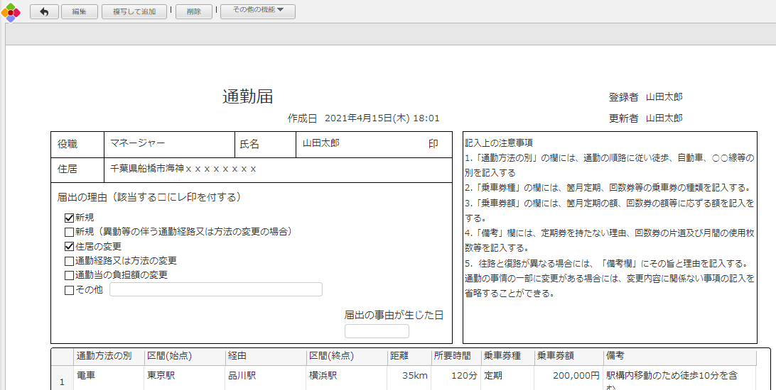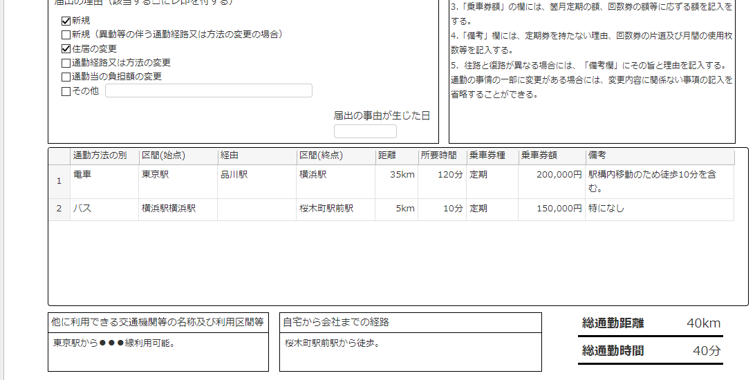作成日、申請者役職、氏名、住所、届け出の事由、届け出の事由が生じた日付、通勤方法、区間、経由駅、距離、時間、券種、金額、備考、総距離、総時間、データ登録者、データ更新者