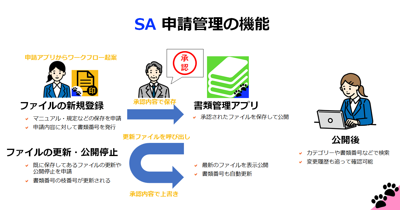 ファイル公開の為の登録申請や、登録済みのファイルに対する変更、公開停止をワークフロー経由で行えます。