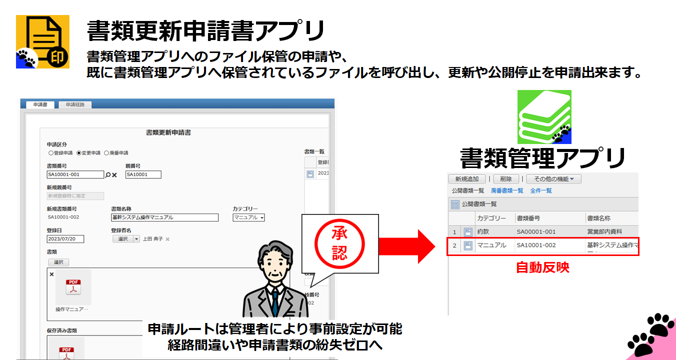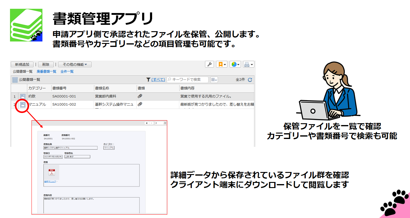 様々な拡張子のファイルを保存できるアプリケーション。ワークフロー機能との連携により、ファイルの保管と書類番号の管理に申請承認を活用出来ます。
