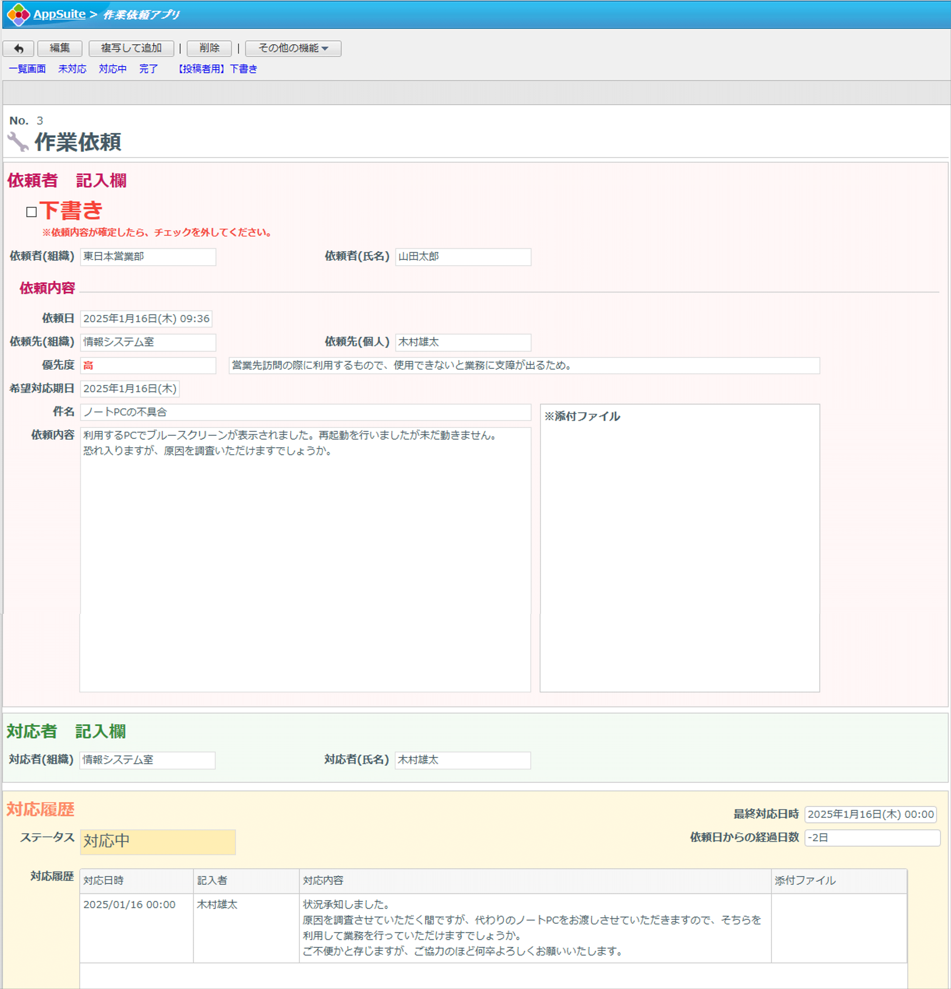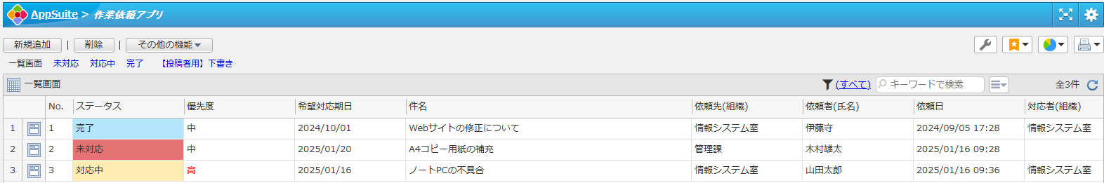 依頼者組織、依頼者氏名、依頼日、依頼先組織、依頼先個人、優先度、希望対応期日、件名、依頼内容、添付ファイル
