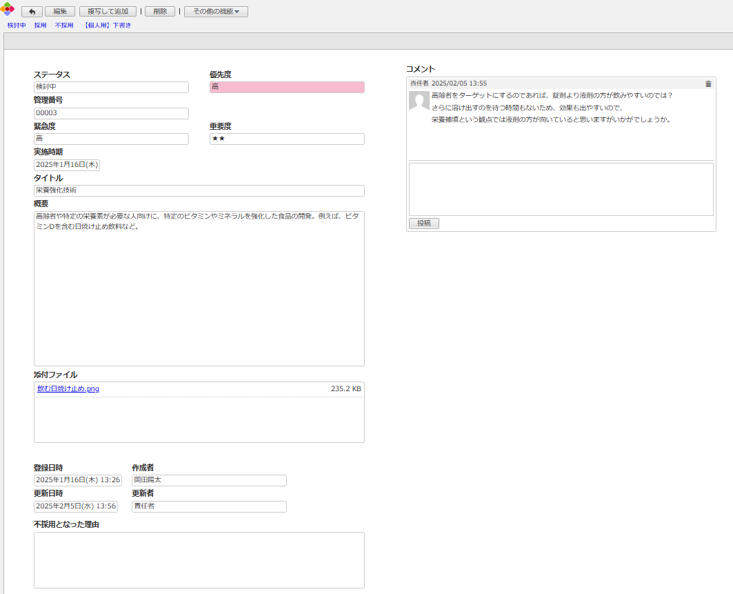 ステータス、優先度、管理番号、緊急度、重要度、実施時期、タイトル、概要、添付ファイル、コメント