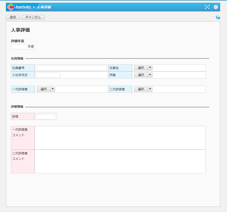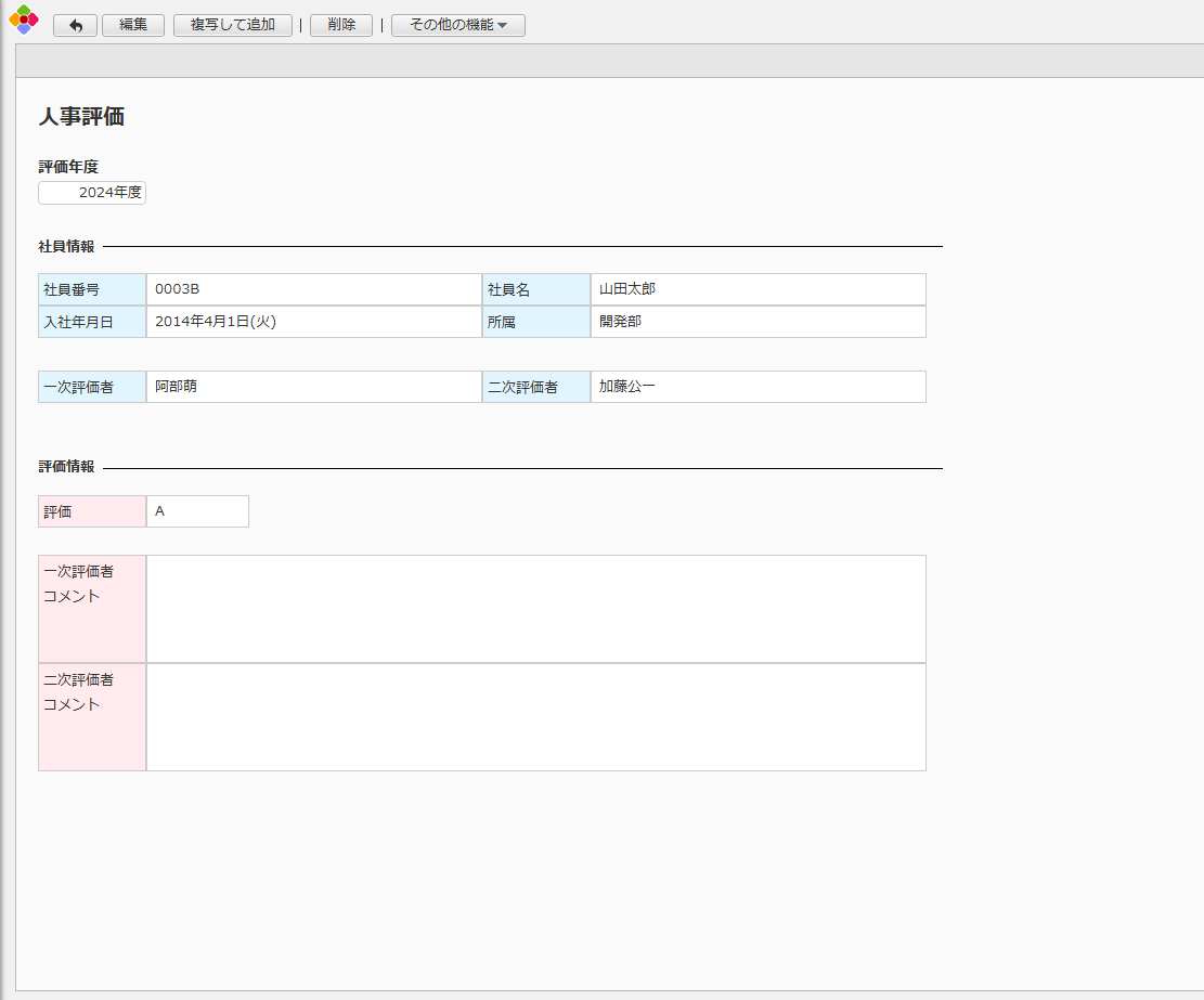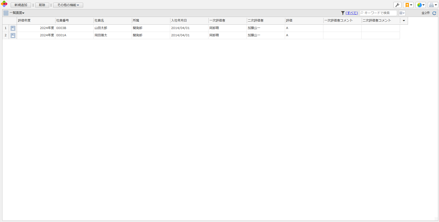 評価年度、社員番号、社員名、入社年月日、所属、一次評価者、二次評価者、評価、一次評価者コメント、二次評価者コメント