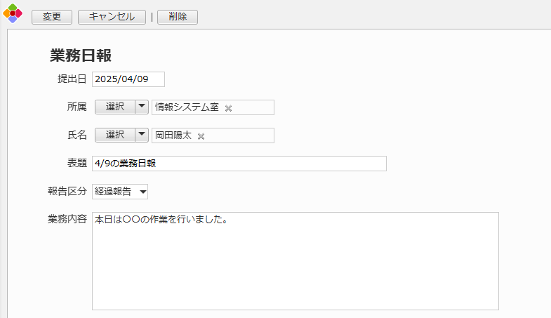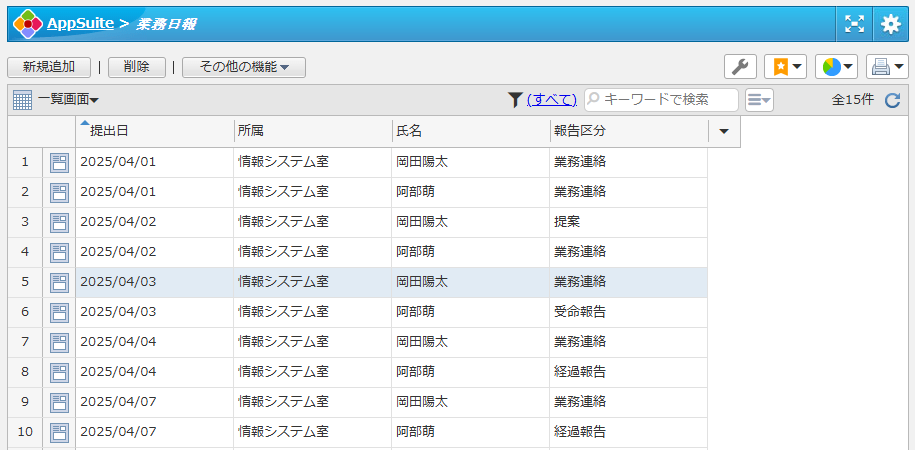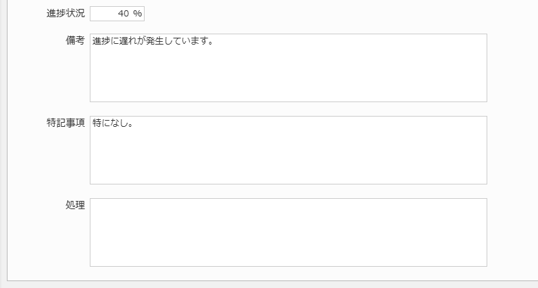 提出日、所属、氏名、表題、報告区分、業務内容、進捗状況、備考、特記事項、処理