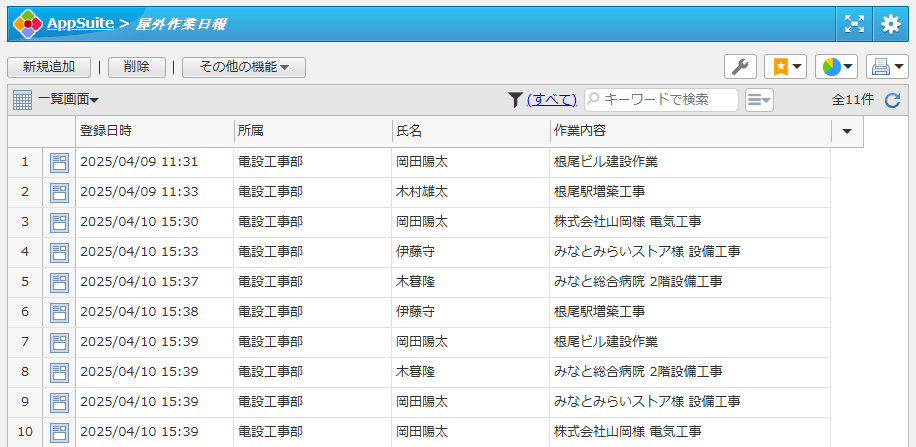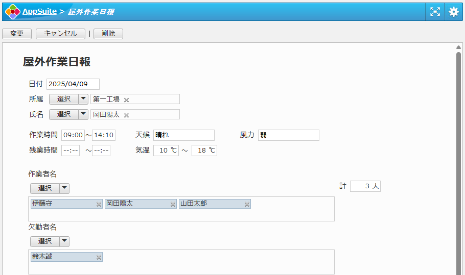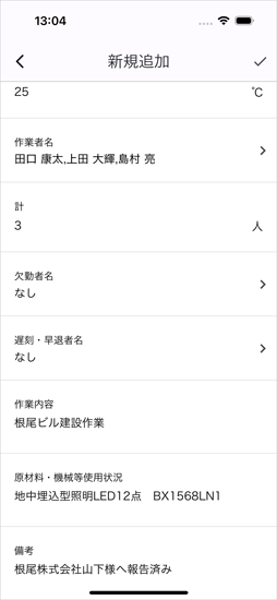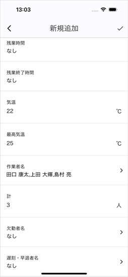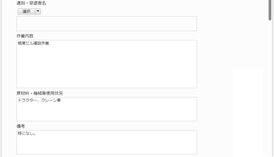 日付、所属、氏名、作業時間、天候、風力、残業時間、気温、作業者名、人数、欠勤者名、遅刻・早退者名、作業内容、原材料・機械等使用状況、備考