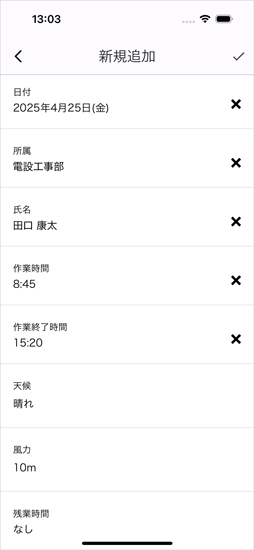 細かな作業時間設定、屋外作業に関係する天候や気温の入力欄などを設けています。