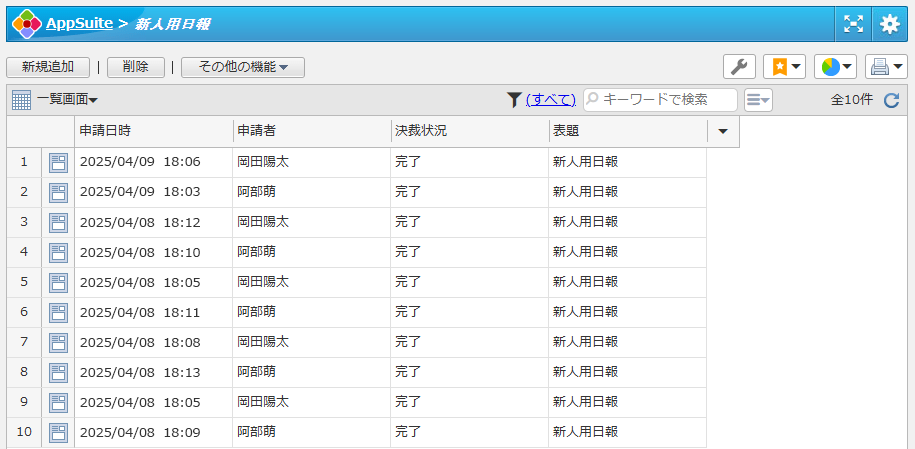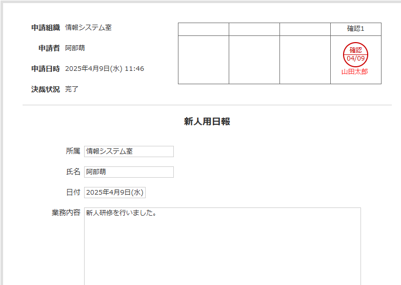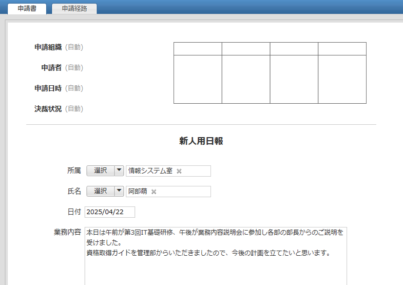 新入社員が作業内容を報告・申請するための申請書アプリです。