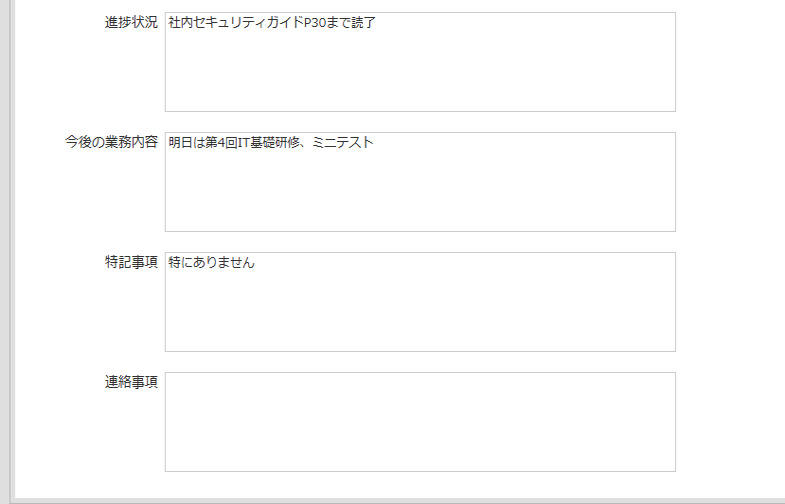 所属、氏名、日付、業務内容、進捗状況、今後の業務内容、特記事項、連絡事項