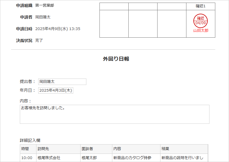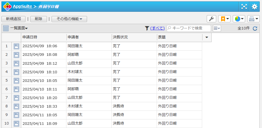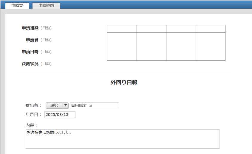 AppSuiteのアプリをワークフローに組み込んで申請書式として利用することができます。報告を確認するメンバーを経路に設定すると、提出後その相手に届きます。