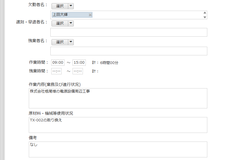 作業日、部課、記入者氏名、天候、風力、作業者名、欠勤者、遅刻・早退者名、残業者名、作業時間、残業時間、作業内容、原材料・機械等使用状況、備考