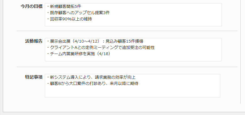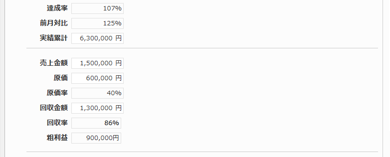 所属、氏名、日付、先月実績、今月実績、今月目標、達成率、前月対比、実績累計、売上金額、原価、原価率、回収金額、回収率、粗利益、今月の目標、活動報告、特記事項
