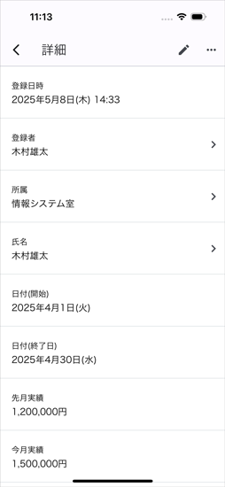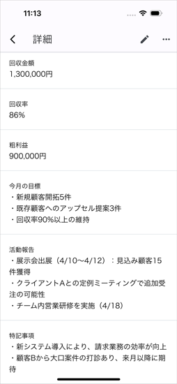 月間の報告を決められたテンプレートで提出。各自提出した報告がアプリ上に集まるので提出状況の見える化が行えます。金額ベースでの入力欄が設けられているため、営業職などの月次報告に適しています。
