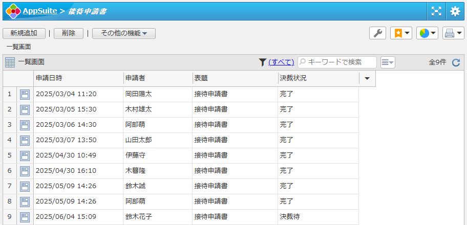 接待申請の申請日時や決裁状況を一覧できます。経費の管理部署において最新状況の把握に便利です。