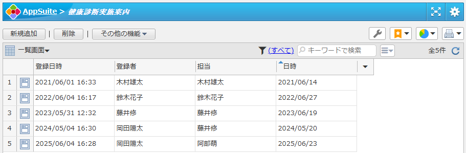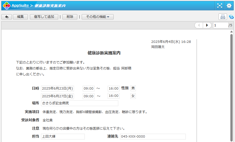 健康診断の予定や内容を記載して、対象者への回覧情報の履歴を管理するためのアプリです。