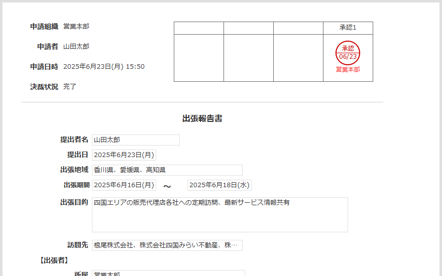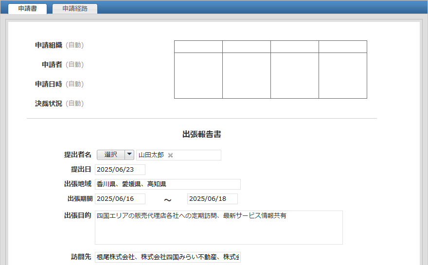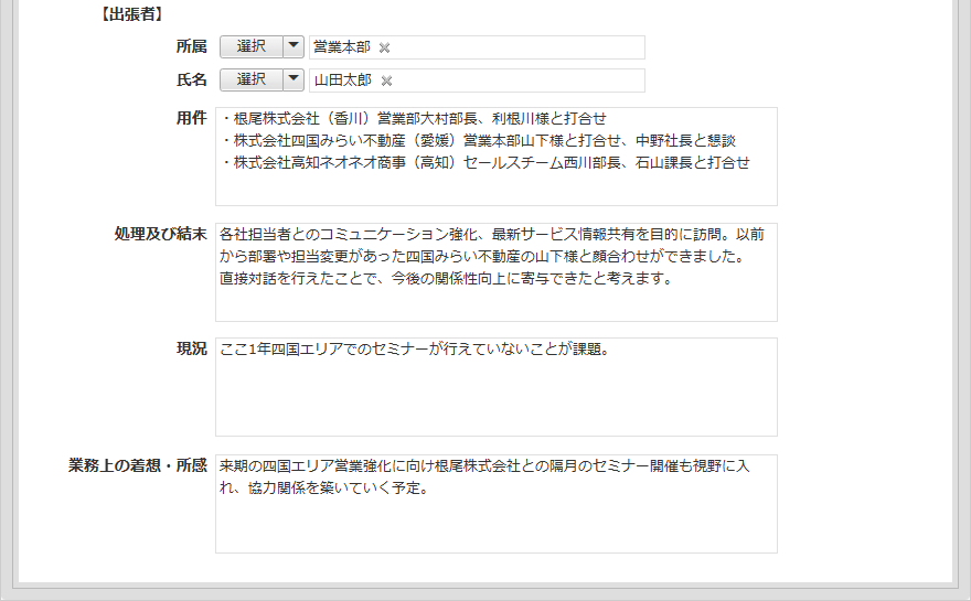 提出者名、提出日、出張地域、出張期間、出張目的、訪問先、出張者所属、出張者氏名、用件、処理及び結末、現況、業務上の着想・所感