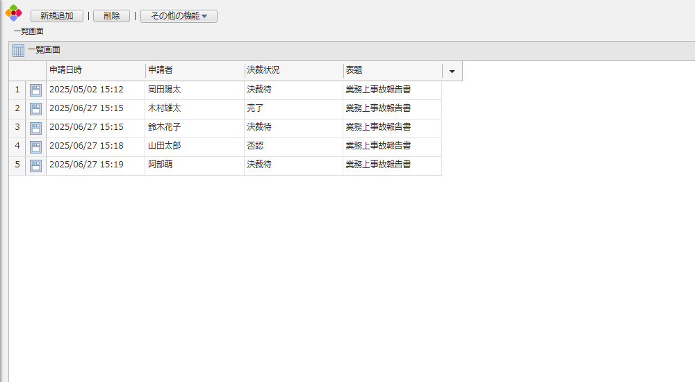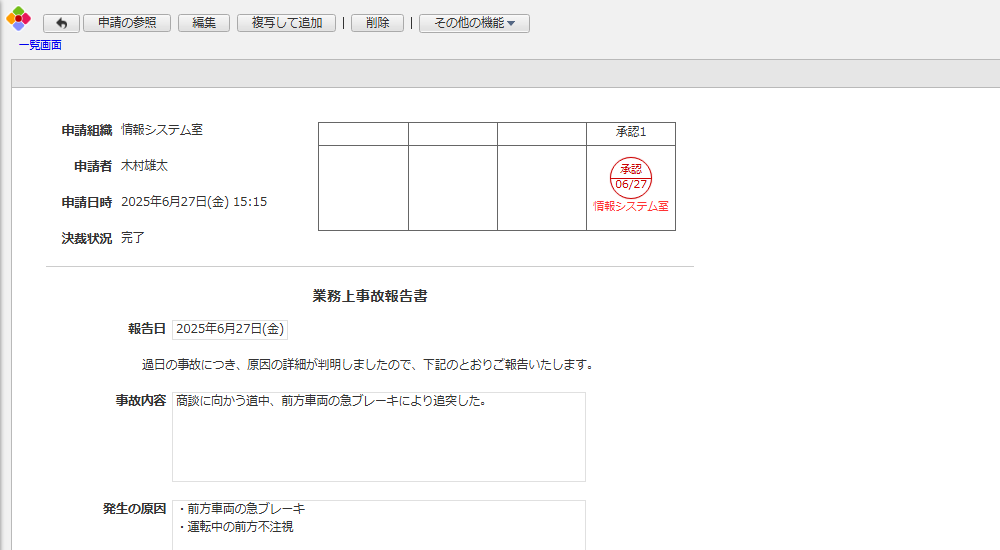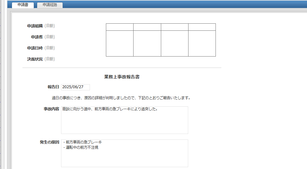 見やすく入力しやすい申請書です。このアプリをワークフローと組み合わせて、関係者への報告をスムーズに行うことができます。