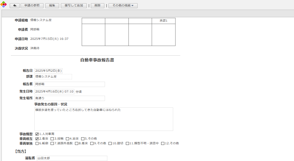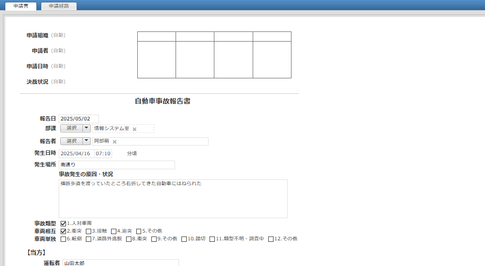 事故発生の原因や状況、事故当事者に関する車両・免許等の情報を報告することができます。