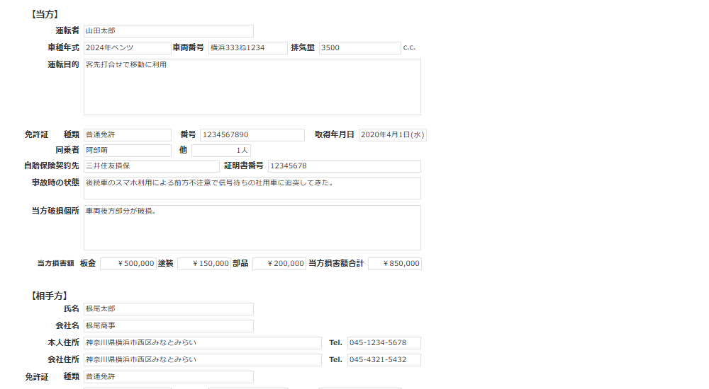 報告日、部課、報告者、発生日時、発生場所、事故発生の原因・状況、事故類型、車両相互事故種別、車両単独事故種別、当方(運転者、車種年式、車両番号、排気量、運転目的、免許証種類、番号、取得年月日、同乗者、自賠保険契約先、証明書番号、事故時の状態、破損個所、損害額)、相手方(氏名、会社名、本人住所、本人電話番号、会社住所、会社電話番号、免許証種類、車種年式、車両番号、排気量、自賠保険契約先、証明書番号、事故時の状態、破損個所、主張、損害額(見積)、人身(負傷の度合))、目撃者(氏名、住所)、所轄警察署、事故処理(備考)