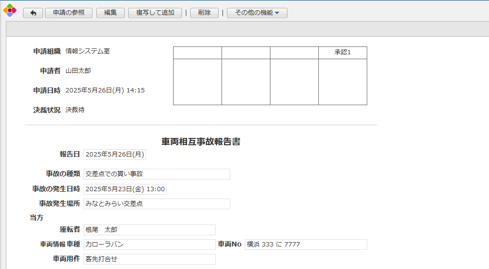 見やすく入力しやすい申請書です。このアプリをワークフローと組み合わせて、関係者への報告をスムーズに行うことができます。