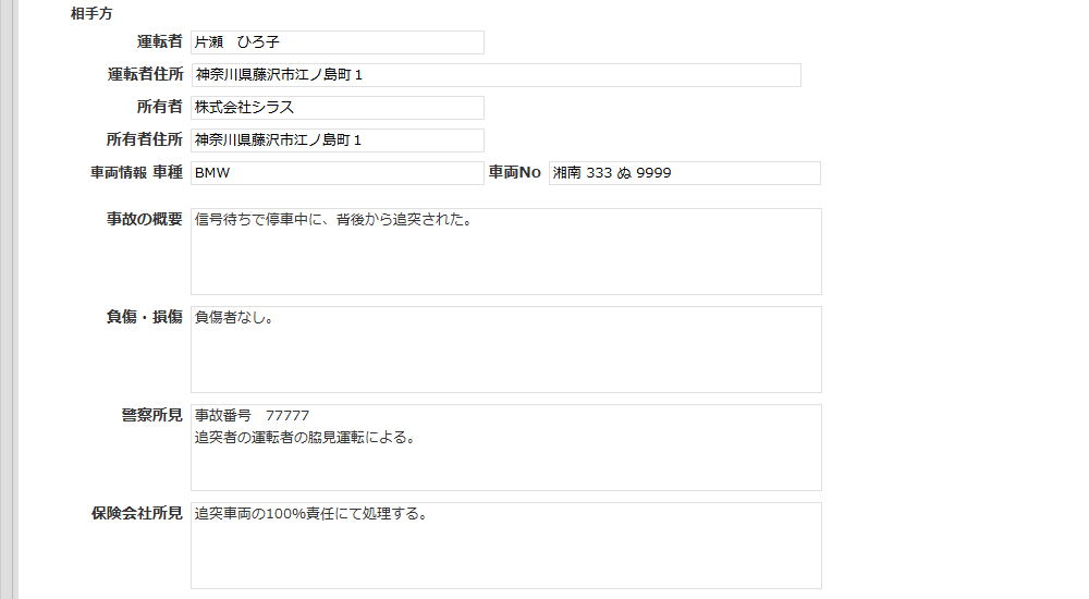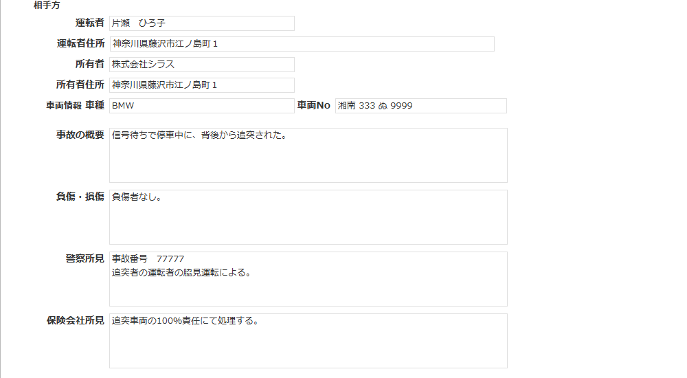 事故内容の詳細や、事故当事者に関する情報、警察と保険会社の所見も合わせて報告することができます。