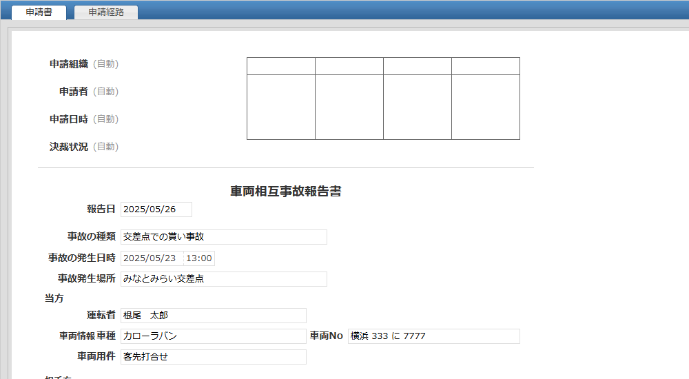 報告日、事故の種類、事故の発生日時、事故発生場所、当方の運転者・車種・車両No・車両用件、相手方運転者・運転者住所・所有者・所有者住所・車種・車両No、事故の概要、負傷・損傷、警察所見、保険会社所見
