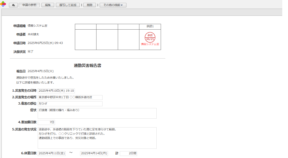 通勤災害に関する詳細情報、休業日数などを報告することができます。