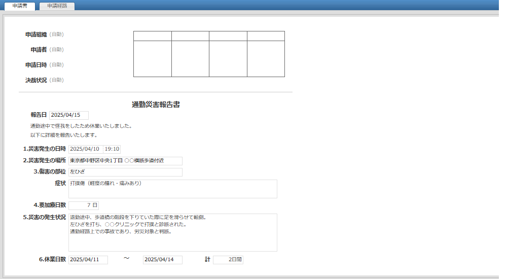 災害発生の日時、災害発生の場所、傷害の部位、症状、要加療日数、災害の発生状況、災害の発生状況、休業日数