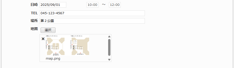 行事名、目的、主催者、日時、TEL、場所、地図