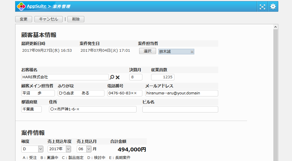 営業案件ごとに受注の確度や金額、活動履歴を記録するためのアプリです。