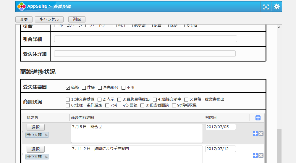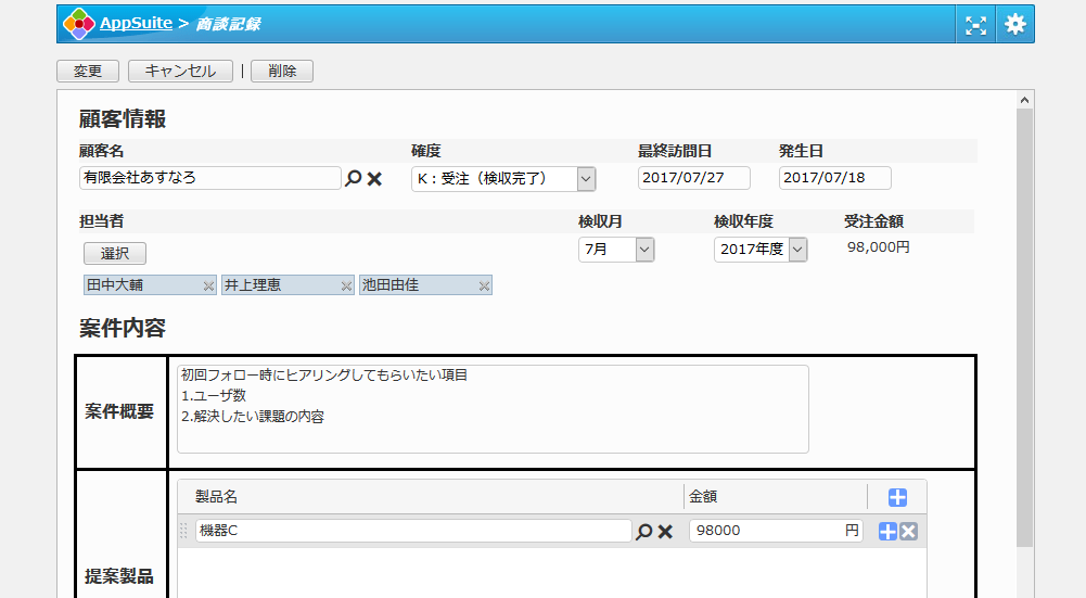 商談ごとに営業活動の進捗、売上見込みを管理するアプリです。