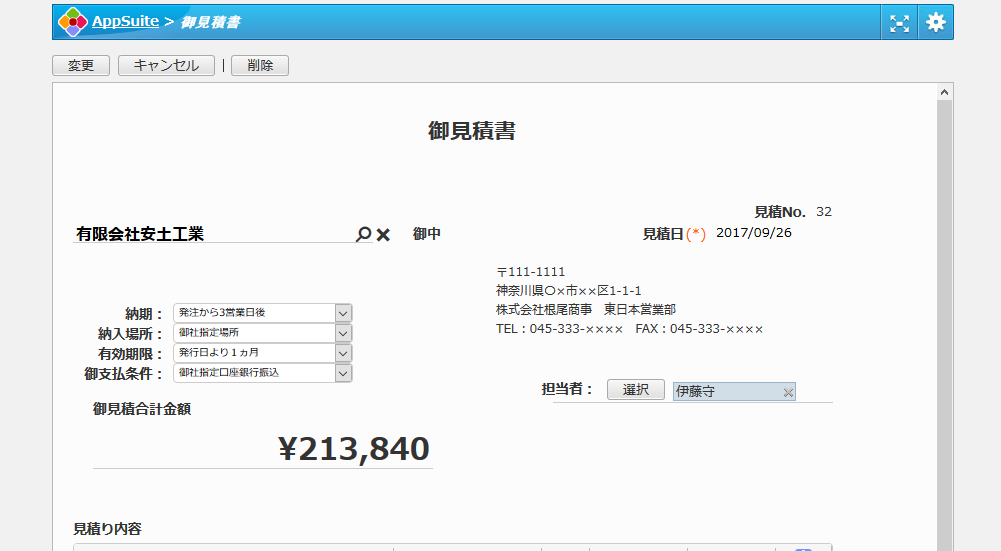顧客情報、製品情報と紐づけて情報を連携、見積書作成の際の記入ミスを減らし、見積書発行業務の効率を向上します。印刷もきれいな表示で出力されます。