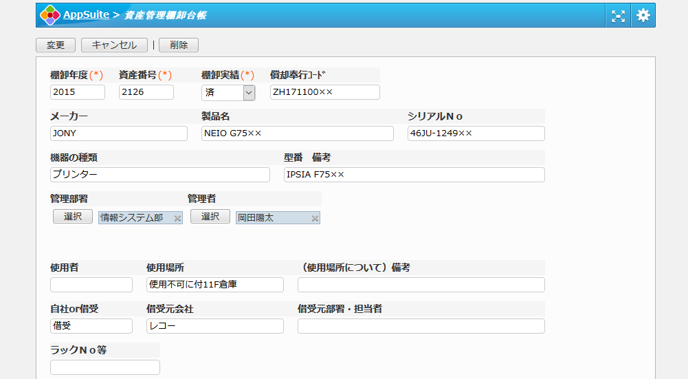 棚卸年度、棚卸実績有無、資産番号、機器情報、管理者、使用者および使用場所、稟議番号、購入金額、購入日